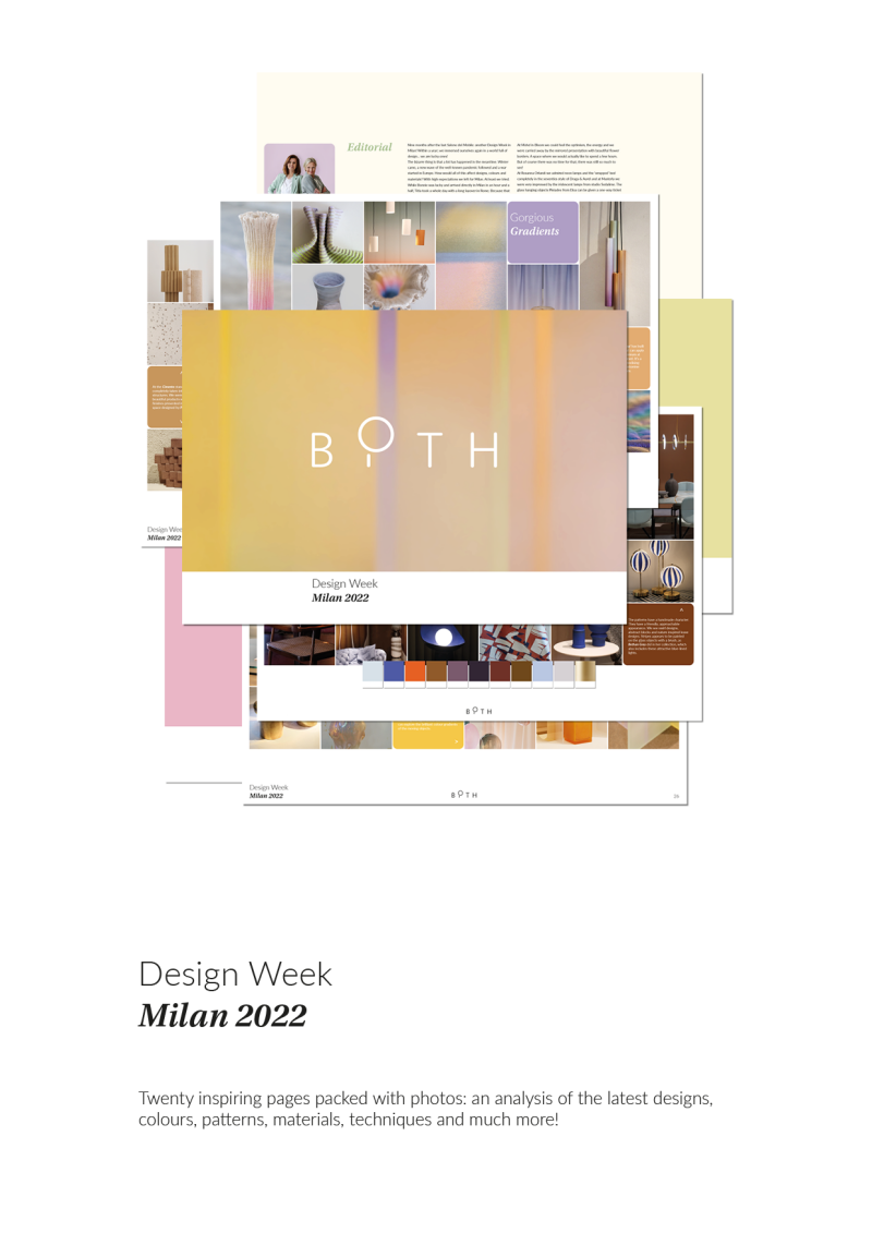 Download your Milan 2022 Trend Report here. In your mailbox right after placing your order! We will show you the main trends, detailed in several mood boards. We will also zoom in on the materials, shapes, designs and colours.